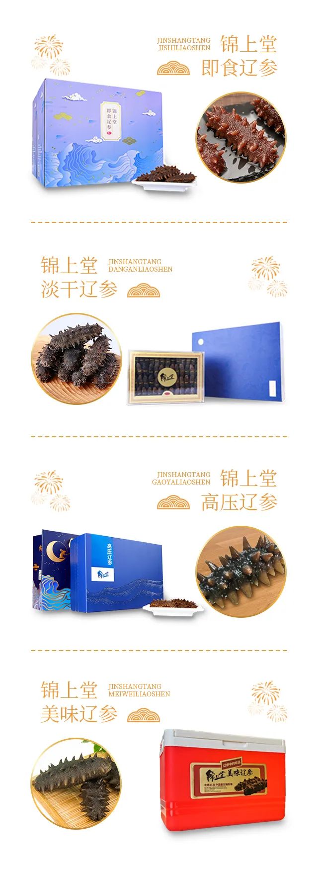 家人們,眼瞅著2022年的春節(jié)就要掄著膀子走來啦,在外奔波忙碌了一整年的人們也開始大包小包的回家過年了,想到再過幾天就能坐在老家炕頭上嗑瓜子,在熙攘的集市淘一盆好兆頭的花,和家人一起張羅年夜飯,心里對于家和年味又多了許多興奮和期待。屬虎的小伙伴你們24歲了開心嗎?過本命年小紅腰帶置辦妥當(dāng)了沒?過節(jié)的年貨快買起來哈。今年錦上堂給大家準(zhǔn)備了幾款健康美味的海參年貨,都是養(yǎng)生好物,您提溜著走親訪友準(zhǔn)受歡迎,都會夸你送禮送到心坎兒上、會疼人兒,攏共4樣兒。